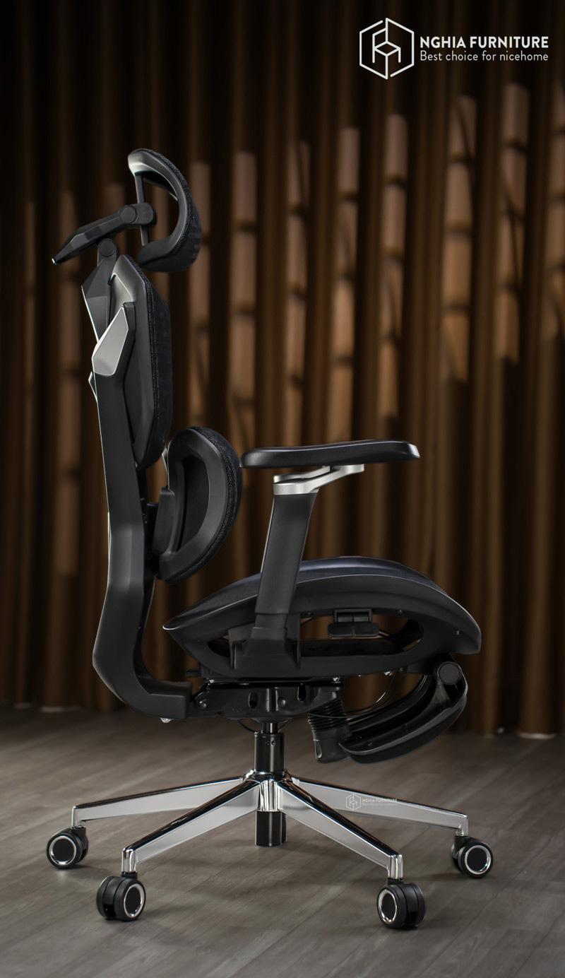 The chair base is made of high-grade chrome-plated steel, with a diameter of 350mm, providing excellent load-bearing capacity and high stability. The 60mm diameter PU wheels rotate 360 ​​degrees flexibly, do not scratch the floor, and operate extremely smoothly, minimizing noise – making it ideal for quiet workspaces or bedrooms.