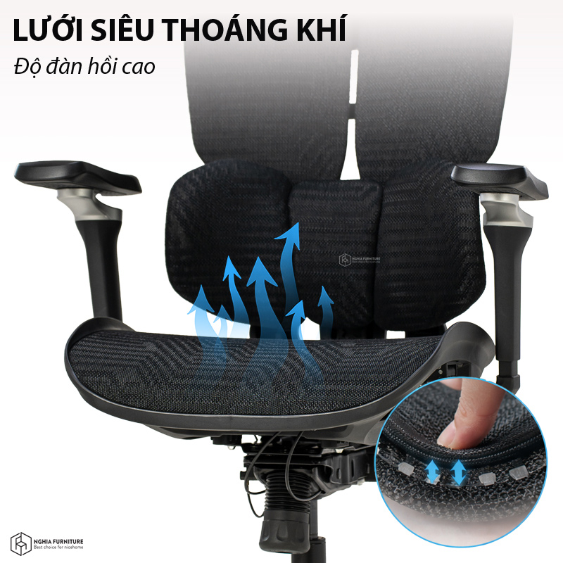 The entire backrest and seat cushion use premium DuPont mesh fabric from the USA, which is 4-way stretchable and has up to 83% elasticity. This material is not only exceptionally breathable – extremely suitable for hot and humid climates – but also skin-friendly and does not cause stuffiness. The thick mesh and sturdy structure help the chair maintain its tension, preventing sagging or deformation after prolonged use.